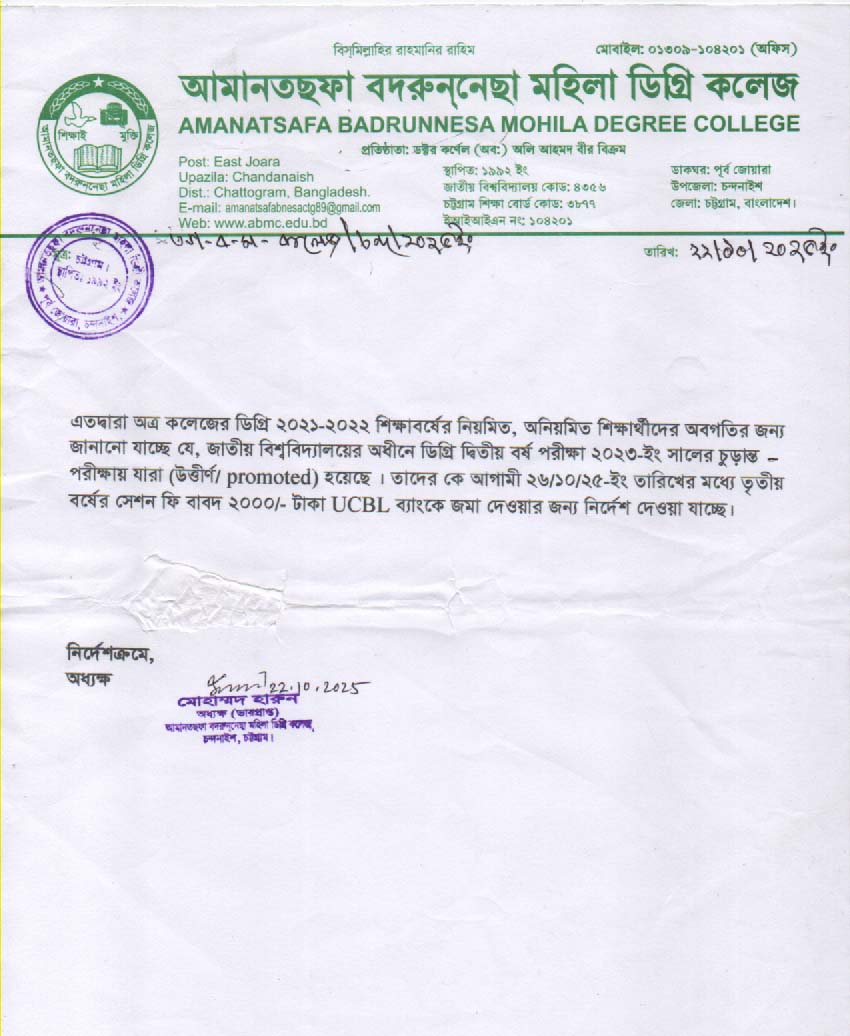 ডিগ্রি ২য় বর্ষে সেশন ফি সংক্রান্ত নোটিশ (২য় বর্ষে ভর্তি সংত্রান্ত)