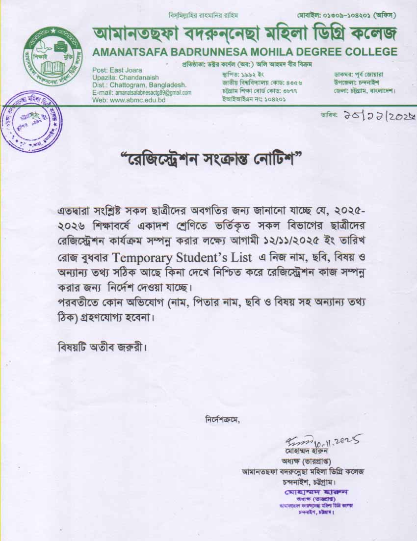 ২০২৫-২০২৬ শিক্ষাবর্ষে একাদশ শ্রেণিতে ভর্তিকৃত সকল ছাত্রীদের রেজিস্ট্রেশন সংক্রান্ত নোটিশ