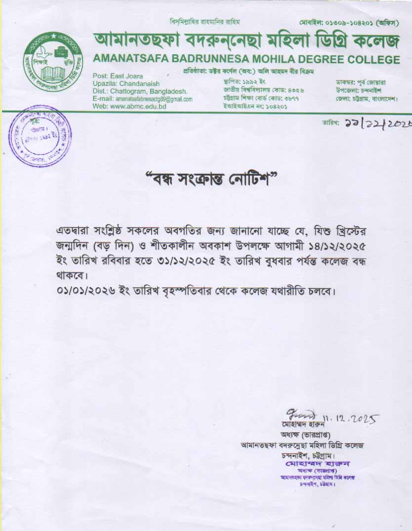 বন্ধ সংক্রান্ত নোটিশ-২০২৫